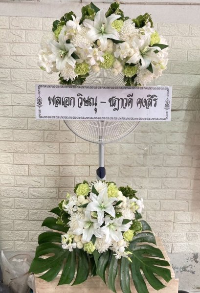 พวงหรีดพัดลม 18 นิ้วดอกไม้สด สามารถเปลี่ยนโทนสีดอกไม้ได้