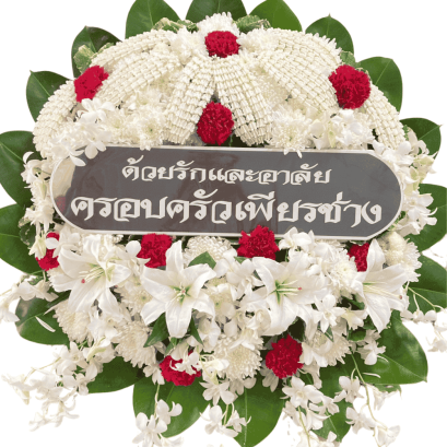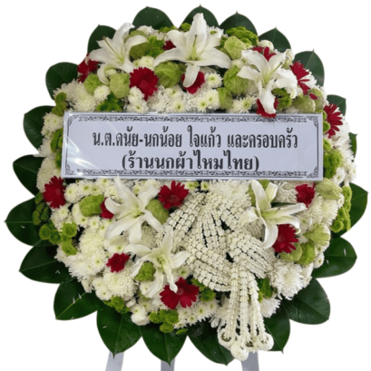 พวงหรีดดอกไม้สดโทนสีขาวแดง งานปราณีตด้วยรักสด พวงใหญ่สวยงาม