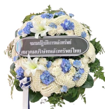 พวงหรีดดอกไม้สดโทนสีขาว ขนาดประมาน 100 เซ็นติเมตร ประดับไปด้วยดอกไฮเดรเยียโทนสีฟ้า เพิ่มความปราณีตด้วยดอกรัก สวยดหรูสมราคา