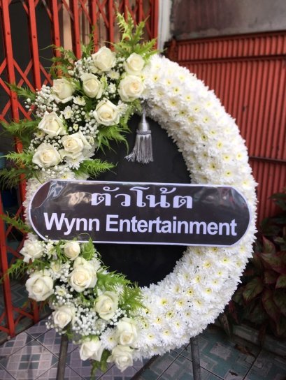 พวงหรีดดอกไม้สดโไทนสีขาวตัดโบว์สีดำ ดอกไม้แน่น