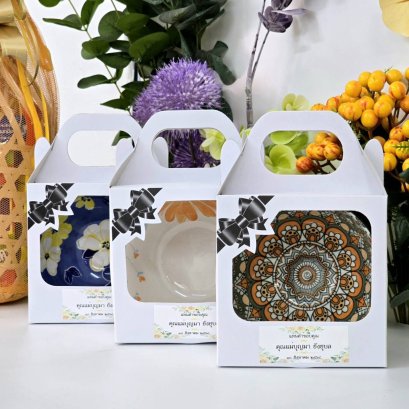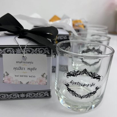 ของชำร่วยแก้วสกรีนพร้อมแจก บรรจุกล่องผูกโบว์ ฟรีข้อความงานฌาปนกิจ