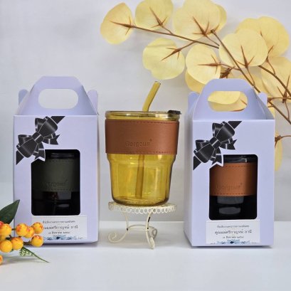 ของชำร่วยแก้วน้ำ ขนาด 450 ml. บรรจุกล่องสวยงามมาพร้อมหลอดมีฝาปิด ติดสติ๊กเกอร์ฟรี