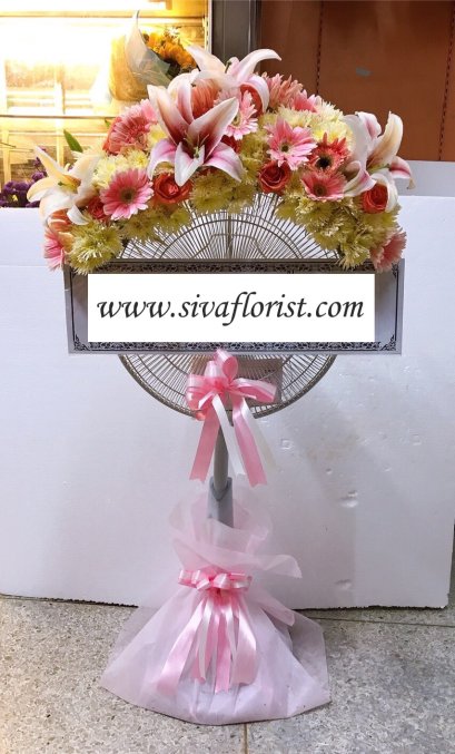 พวงหรีดพัดลมดอกไม้ประดิษฐ์โทนสีชมพู ยี่ห้อฮาตาริปรับระดับได้ ขนาด 16 นิ้ว ราคา 1,650 บาท 18 นิ้ว ราคา 2,000 บาท สั่งซื้อ Line @siva