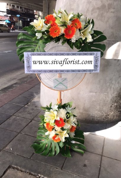 พวงหรีดพัดลมดอกไม้สด Hatari ขนาด16" ประดับด้วยดอกไม้สดโทนสีส้ม เหมาะสำหรับแสดงความอาลัย และยังสามารถส่งต่อบุญด้วยการนำไปบริจาคได้อีกด้วย