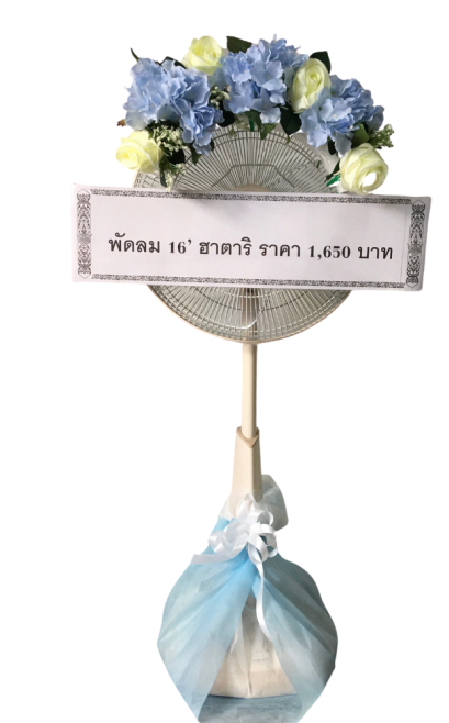 พวงหรีดพัดลมดอกไม้ประดิษฐ์โทนสีฟ้า ยี่ห้อฮาตาริปรับระดับได้ ขนาด 16 นิ้ว ราคา 1,550 บาท 18 นิ้ว ราคา 2,000 บาท