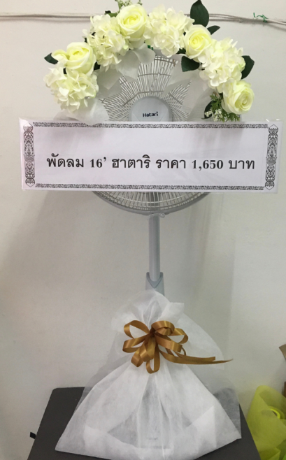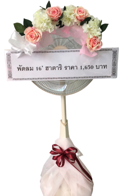 พวงหรีดพัดลมดอกไม้ประดิษฐ์ยี่ห้อฮาตาริปรับระดับได้ ขนาด 16 นิ้ว ราคา 1,550 บาท 18 นิ้ว ราคา 2,000 บาท