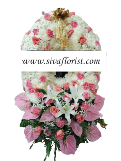 พวงหรีดดอกไม้สดทรงกลมโทนสีขาว- ชมพู ประดับด้วย มัม เบญจมาศขาว หน้าวัวสีชมพู คาร์เนชั่น และกุหลาบชมพู เหมาะกับการแสดงความอาลัยแก่ทุกช่วงวัย