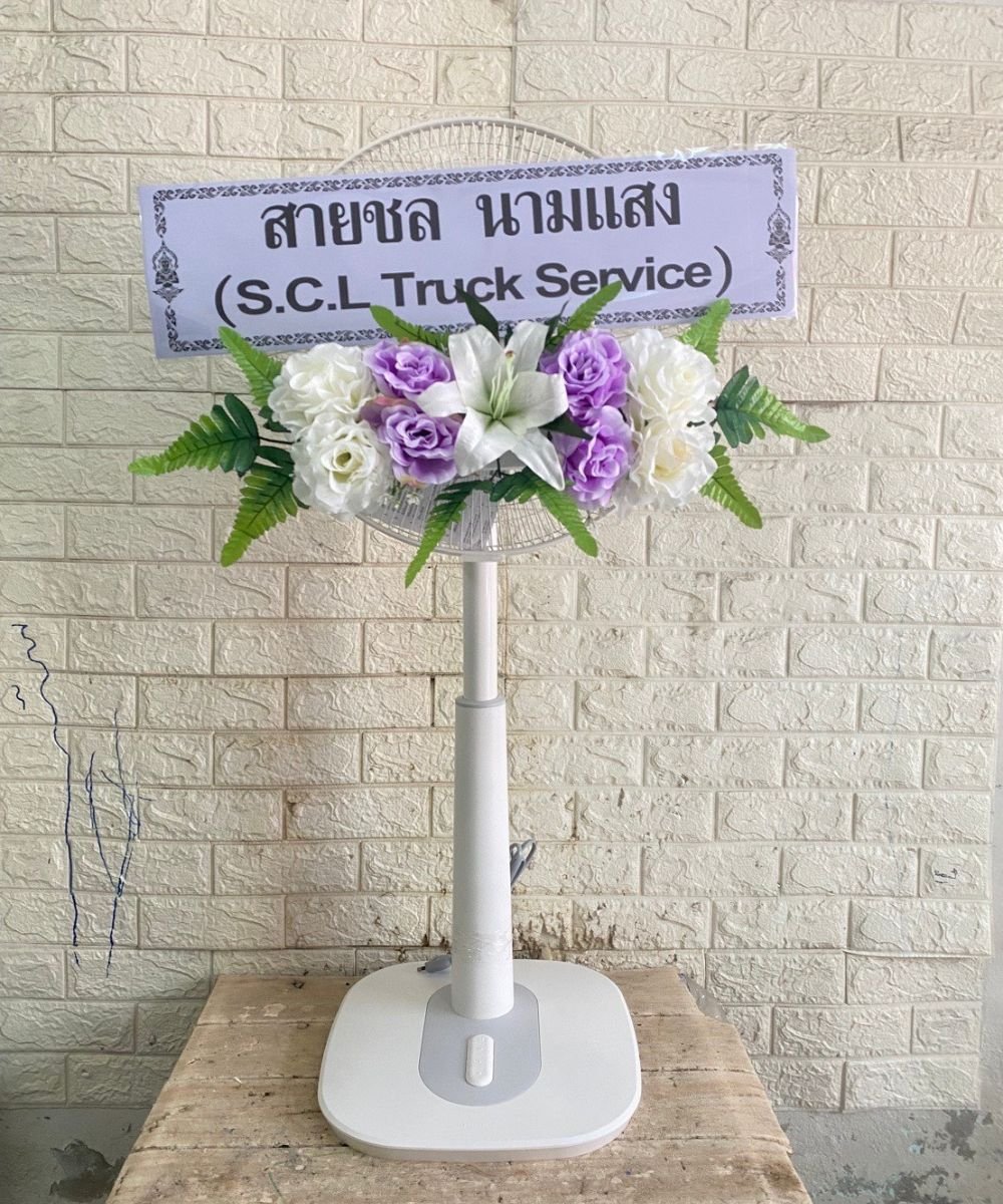 พวงหรีดพัดลมดอกไม้ประดิษฐ์โทนสีม่วง ยี่ห้อฮาตาริปรับระดับได้ ขนาด 16 นิ้ว ราคา 1,550 บาท 18 นิ้ว ราคา 2,000 บาท