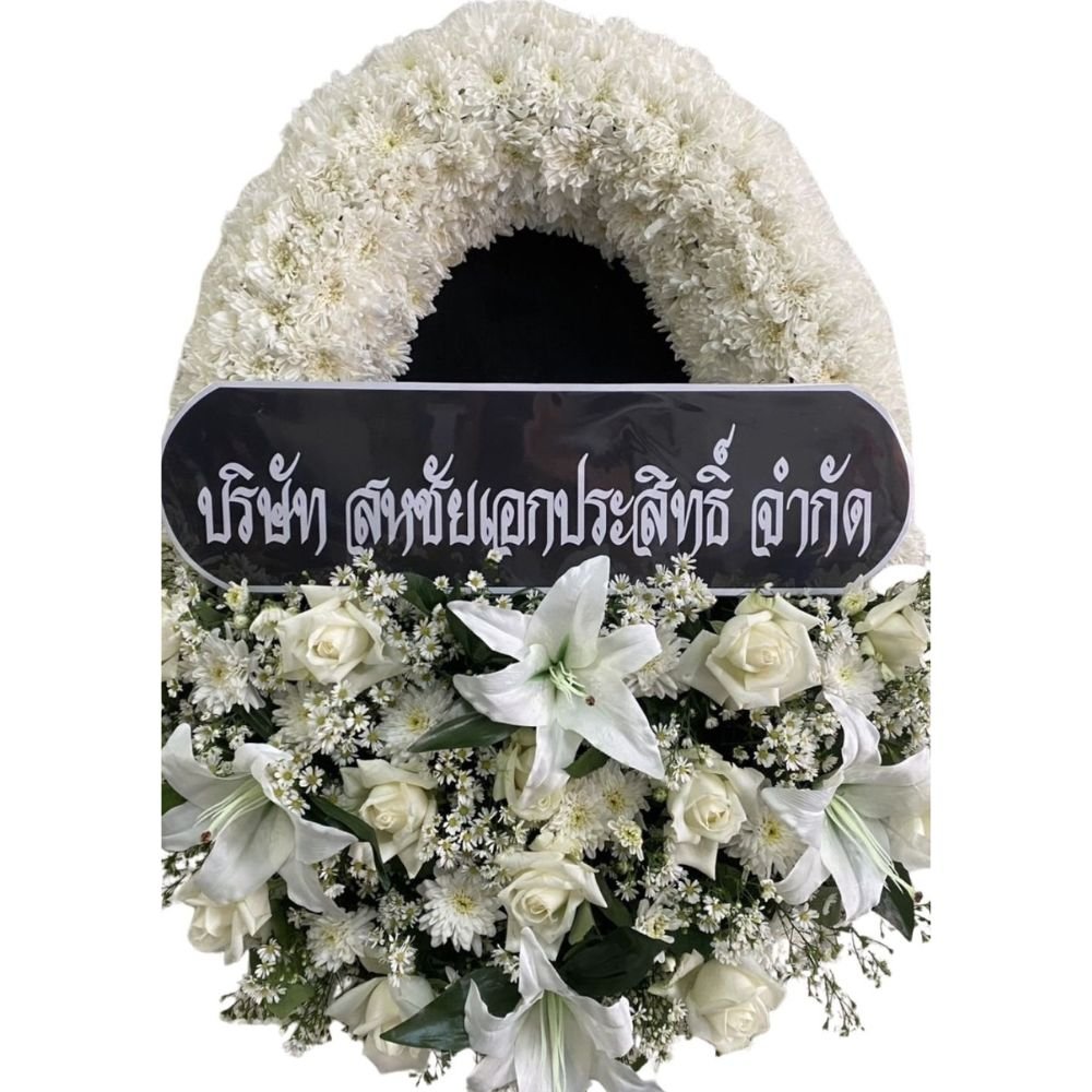 พวงหรีดทรงรีสีขาว ขนาดประมาณ 80x60 เซ็นติเมตร ดอกไม้แน่น เรียบหรู